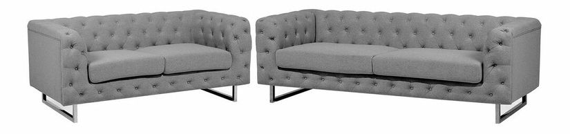 Vylepšete svůj obývací prostor a dodejte mu půvab s touto čalouněnou sedací soupravou, která se skládá z 2-místné a 3-místné pohovky. Její elegantní design, který je inspirován stylem Chesterfield v kombinaci se stylem tuxedo, se hodí do každého moderního, ale i tradičně zařízeného interiéru. Sedací souprava s kvalitním šedým čalouněním má nohy z nerezavějící oceli, tlusté sedací polštáře pro lepší komfort a výrazné prošívání s knoflíky.