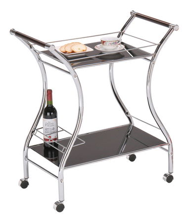 Servírovací stolek B-112 má jednolitý design na obou stranách. Pěknou kovovou konstrukce v chromové barvě doplňuje vkusné černé sklo obou odkládacích částí.