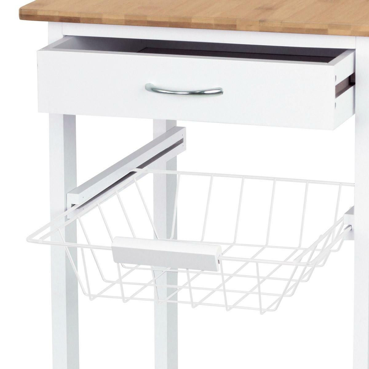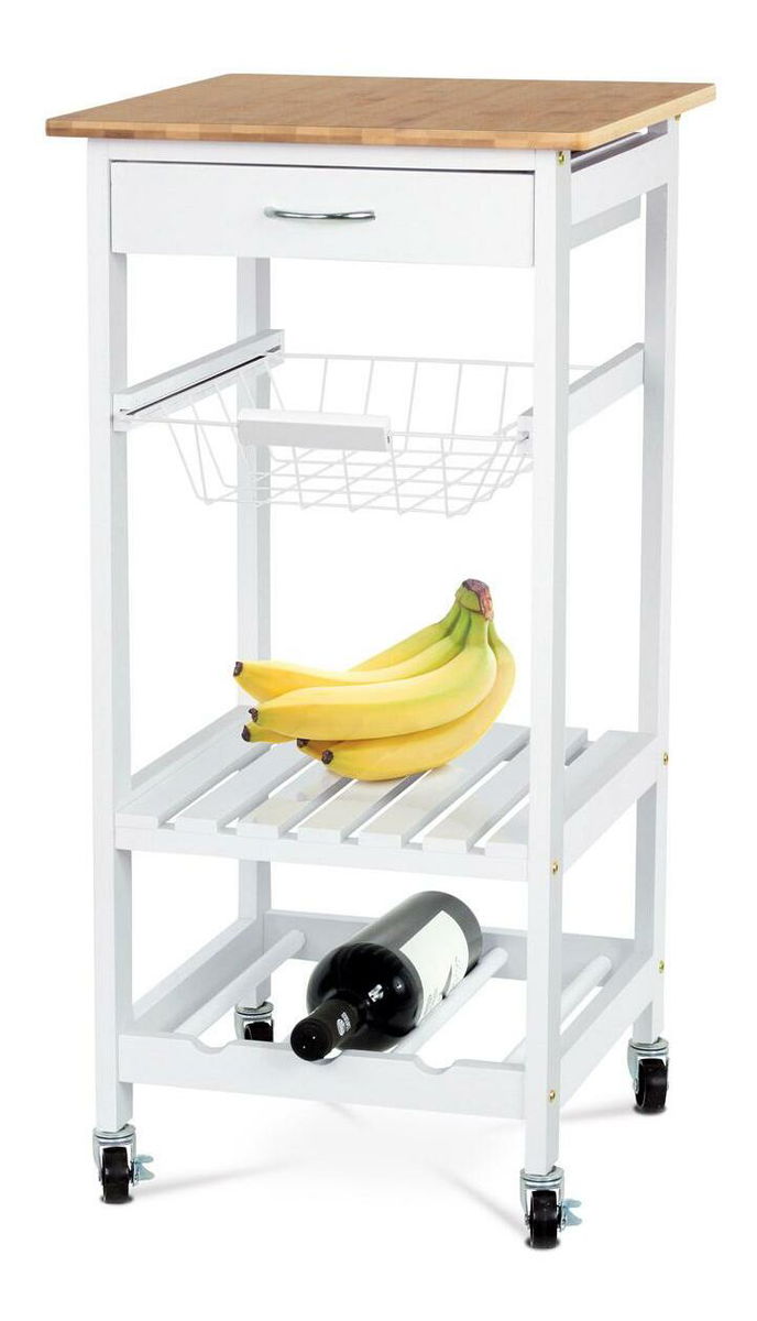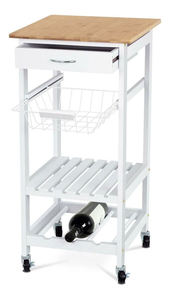ZobrazitServírovací stolek je chytré a praktické doplnění do každé domácnosti. Plní funkci nejen při servírování, ale skvěle slouží jako mobilní úložný prostor, a to nejen do kuchyně. Ve třech patrech nabízí variabilitu možností ukládání. Ve spodním patře je držák na tři láhve, nad ním je laťový rošt pro možné uložení těžšího nádobí a jako poslední tvoří výsuvný drátěný koš s praktickou dřevěnou úchytkou. Ten nabízí nepřeberné možnosti ukládání od ovoce až po nádobí či jiné kuchyňské potřeby. Deska je zhotovena z masivního bambusu v přírodním odstínu, opatřená tlustou vrstvou odolného transparentního laku. Tím je zaručena eliminace poškození desky rozlitou tekutinou. Navíc bambus jako takový odpuzuje vodu. Krytý úložný prostor tvoří jedna menší zásuvka s chromovaným madlem. Zde lze uložit příbory či drobné kuchyňské předměty, příp. jako skryté místo na sladkosti. Konstrukce vozíku je z lakovaných MDF přířezů v bílé matné barvě. Kolečka jsou plastová, obě přední jsou opatřena brzdičkami. Koš je svařený z kovových drátů v bílé matné barvě. Velikost bambusového prkna je 37 x 37 cm, což je příjemné zvětšení kuchyňské plochy a navíc mobilní. Vozík svou univerzálností, provedením a designovou čistou lze využít vlastně jakkoli dle své fantazie. Jen mějte na paměti, že maximální nosnost vozíku je 15 kg.