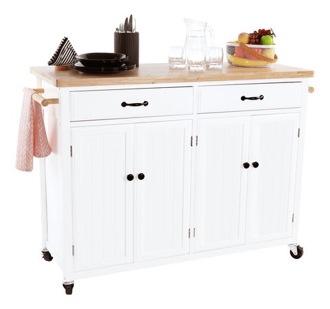 Ještě nemáte svého favorita při servírování jídla a nápojů? Pořiďte si servírovací vozík Gala a určitě si ho zamilujete! Tento praktický a elegantní pomocník přinese s sebou úložný prostor všude tam, kde ho postavíte. Disponuje bohatým úložným prostorem v podobě 2 zásuvek a 2 skříněk, které jsou policí předělené na 2 části. Konstrukce je vyrobena z MDF v bílém provedení, vrchní deska je z masivního dřeva. Gala disponuje i kolečky, dvě z nich jsou brzděná.