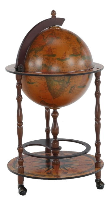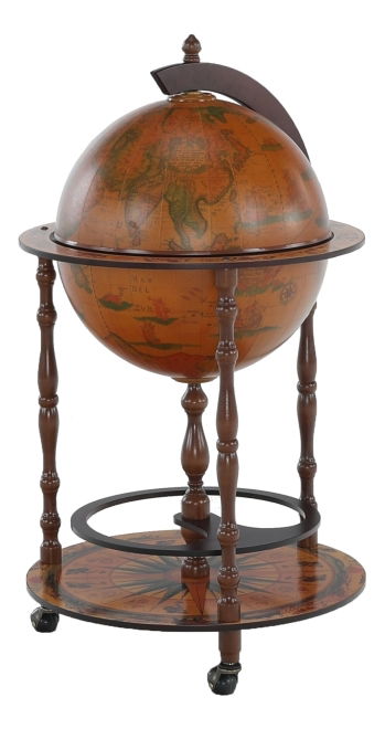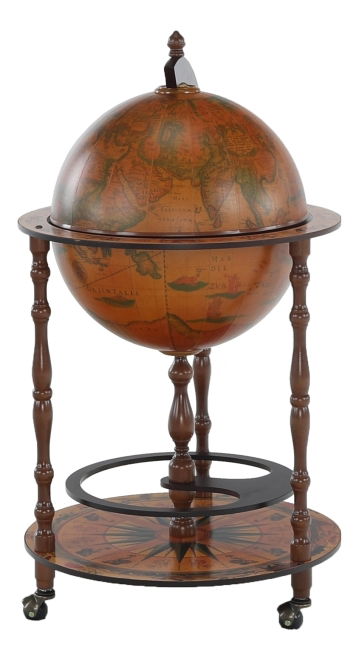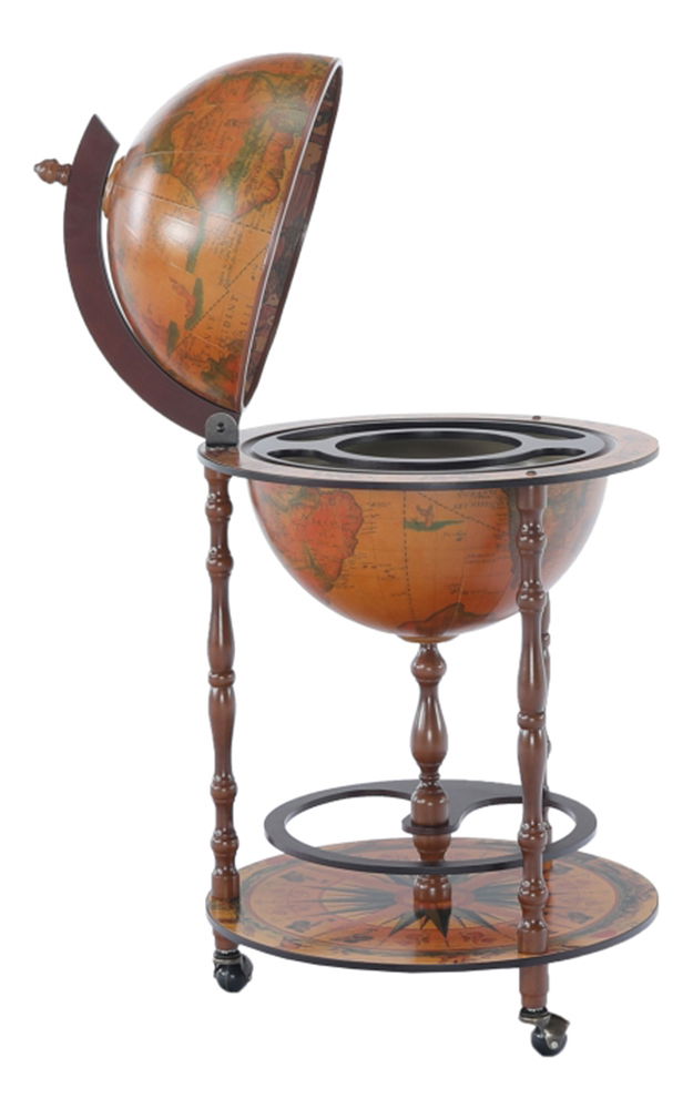 Nádherný servírovací stolek je imitací glóbu, který bude originálním doplňkem v obývacích pokojích nebo pracovnách. Vrchní část glóbu je otočná a odklápí se. Uvnitř je prostor pro lahve a sklenice. Spodní část poslouží jako odkládací tácek pro lahve a sklenice. Stolek má kolečka, čili jej lze jednoduše přesouvat.