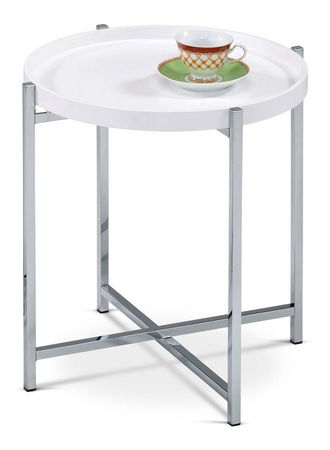 Odkládací stolek v Nordic stylu a kulatého tvaru. Konstrukce v sobě spojuje vyjímatelný dřevěný tác z bukové překližky, v bílé matné a subtilní podnoží zhotovené z kovových profilů čtvercového průřezu 1,5 x 1,5 cm v lesklém chromu. Právě tato podnož zajišťuje vysokou a dokonalou stabilitu celého stolku i při úplném naplnění podnosu, který disponuje velkým vnitřním průměrem 44 cm a hloubkou 2 cm. Vnější průměr je 46 cm a hloubka 3 cm. Přesto stolek působí velmi odlehčeně a subtilně. Své místo najde nejen v seversky laděných interiérech, ale rovněž skvěle bude působit iv interiérech zařízených v jiných stylech. Všude bude tvořit nejen pěkný bytový doplněk, ale hlavně bude skvělý pomocník, ať si na něj odložíte jen šálek s kávou nebo jen křupavé občerstvení k televizi, nebo jej použijete jako součást baru s vyskládanými lahvemi, případně i jako luxusní květinový stolek. Jeho využití je opravdu nepřeberné, závisí jen na vaší fantazii, zda ho chcete mít jako součást obývacího pokoje, chodby, haly či ložnice. Údržba je velmi jednoduchá. Kovové části stačí otřít vlhkým hadříkem. Dřevěný podnos vyjmeme a nečistoty z něj vyklepeme nebo použijeme vysavač a také otřeme vlhkým hadříkem. Přeleštíme suchým hadříkem či papírovou utěrkou a tím je stolek opět čistý a jako nový. Montáž je velmi jednoduchá, zvládne s úplným přehledem středně zručný člověk. Nosnost stolku je do max. 10 kg rovnoměrně rozprostřené zátěže. Průměr stolku je 50 cm, výška 50 cm.