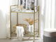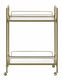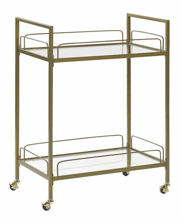 Když potřebujete snadno přemístitelný, multifunkční a zároveň dekorativní kus nábytku, tento vozík je pro vás jako stvořený. Dvě police z tvrzeného skla nabízí dostatek prostoru pro vystavení dekoraci, čerstvých květin, ozdobných košů nebo svíček a také pro servírování nápojů vašim hostům, zatímco zlatý kovový rám zajišťuje stabilitu. Díky čtyřem kolečkům můžete vozík v případě potřeby snadno přemístit z jídelny do obývacího pokoje.