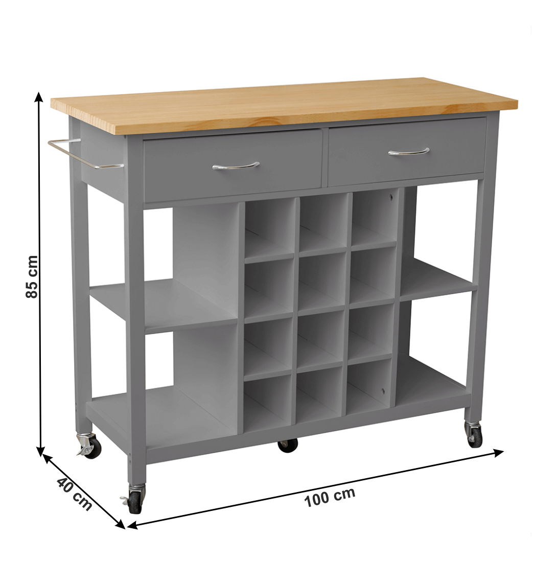 Pokud vás nebaví neustále odbíhání od návštěvy, servírovací vozík s regálem na láhve Dillan je pro vás ideální volbou! Nabízí úložný prostor v podobě 2 zásuvek s úchytkami, regál uprostřed je rozdělen na okénka, do kterých můžete poskládat láhve toho nejlepšího a nejchutnějšího vína. Konstrukce sestává z MDF a vrchní deska je z masivního borovicového dřeva. Po stranách je otevřený úložný prostor rozdělen policí. Z boční strany vozík disponuje držákem na utěrku. Díky 4 kolečkům bude manipulace s vozíkem Dillan velmi jednoduchá, dvě z nich mají brzdu, zajišťují tak stabilitu vozíku. S vozíkem Dillan bude vaše servírování i úklid jednoduché a rychlé.