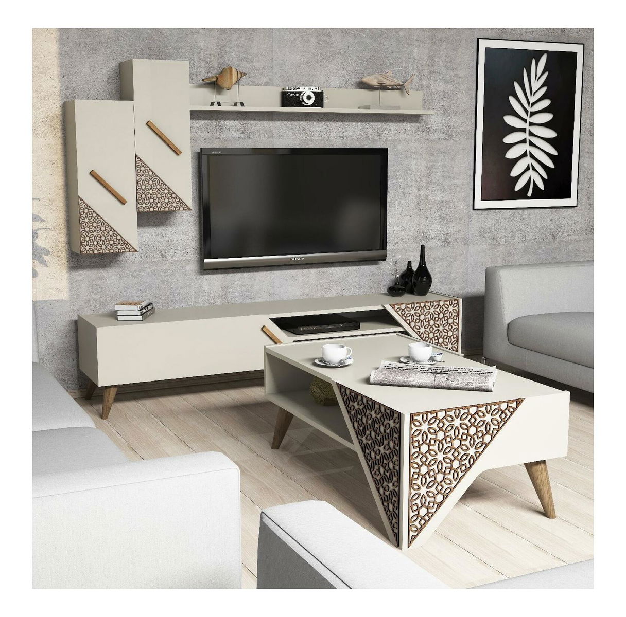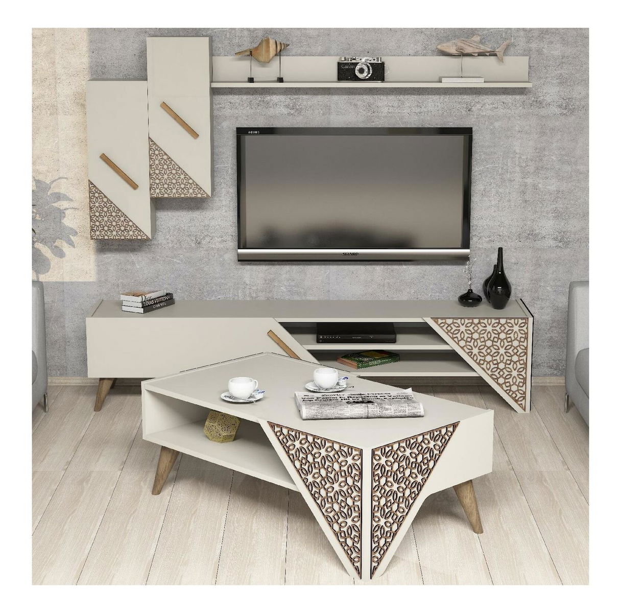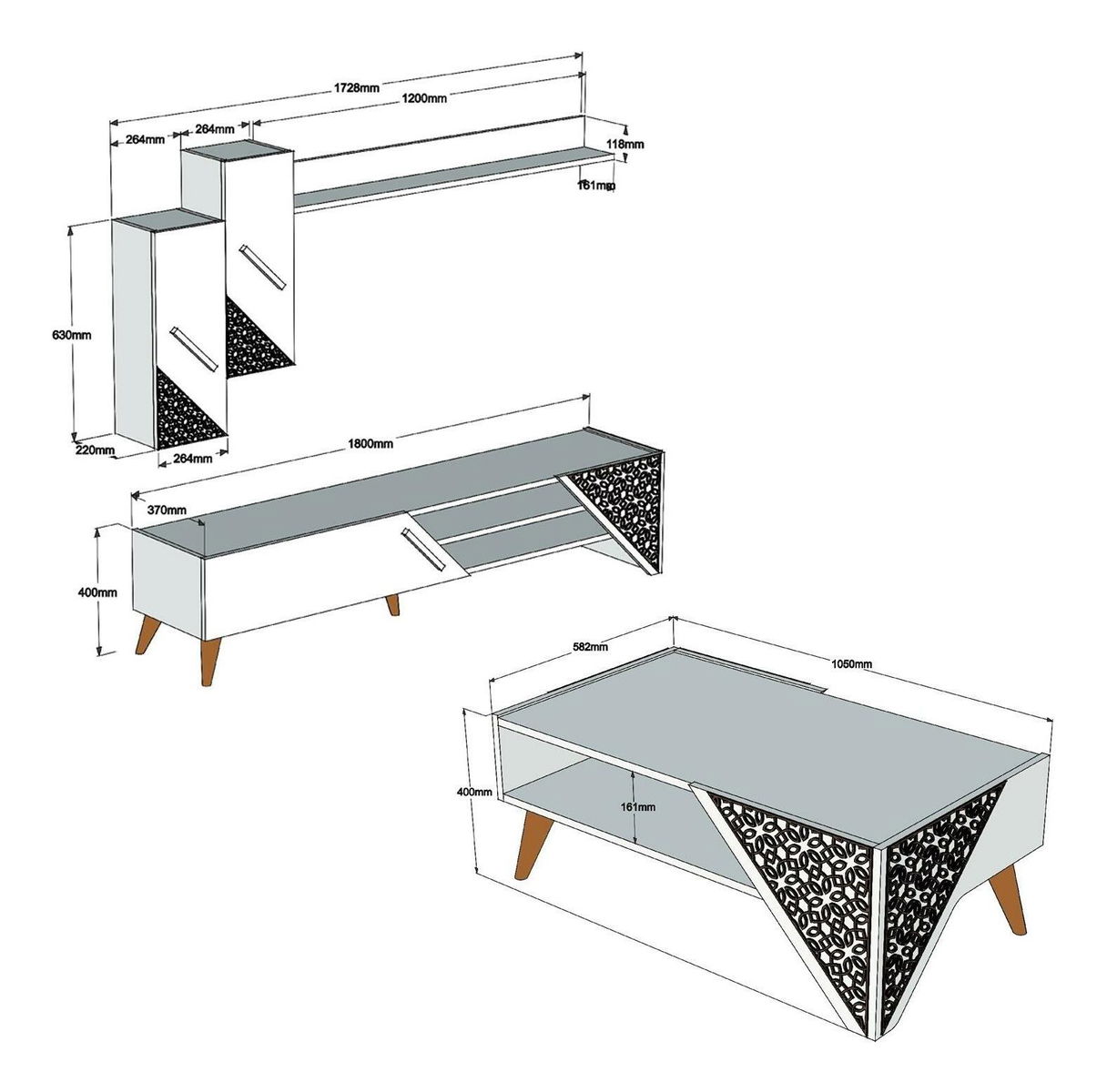 tloušťka: 18 mm, 4 mm, cnc reliéfní plastové nohy, velikost TV jednotky: šířka: 180 cm, výška: 40 cm, hloubka: 37 cm, 2-patrový konferenční stolek velikost: šířka: 105 cm, výška: 40 cm, hloubka : 58,2 cm, výška police: 16,1 cm, velikost nástěnné police: šířka: 120 cm, výška: 11,8 cm, hloubka: 16,1 cm, velikost skříňky: šířka: 26,4 cm, výška: 63 cm, hloubka: 22 cm