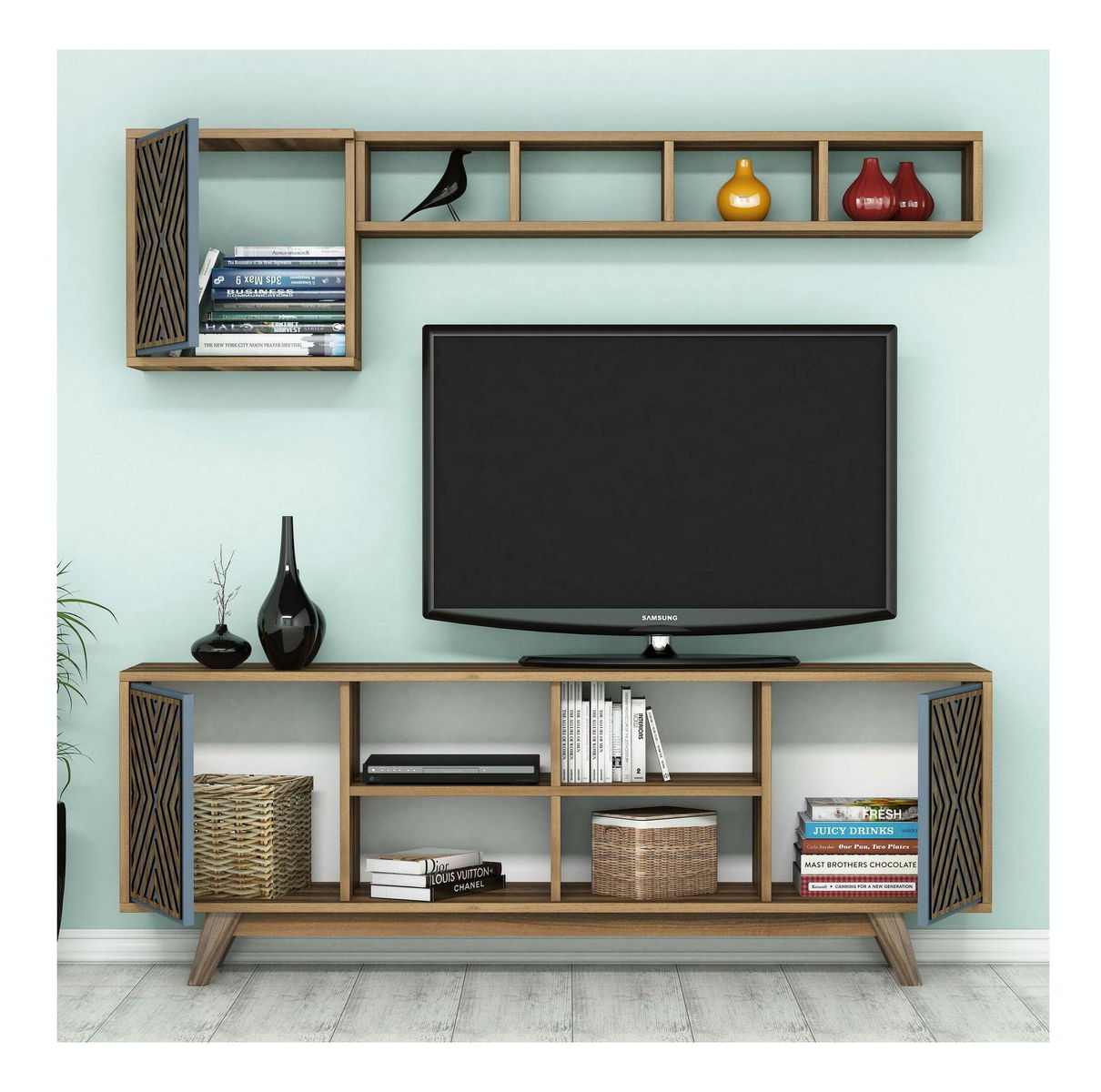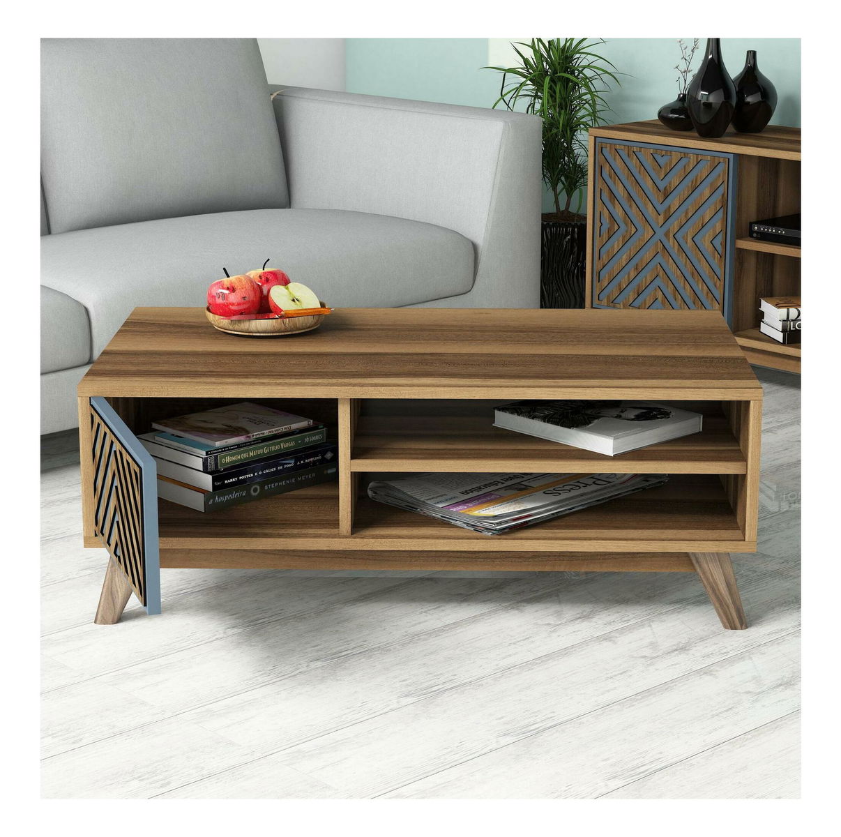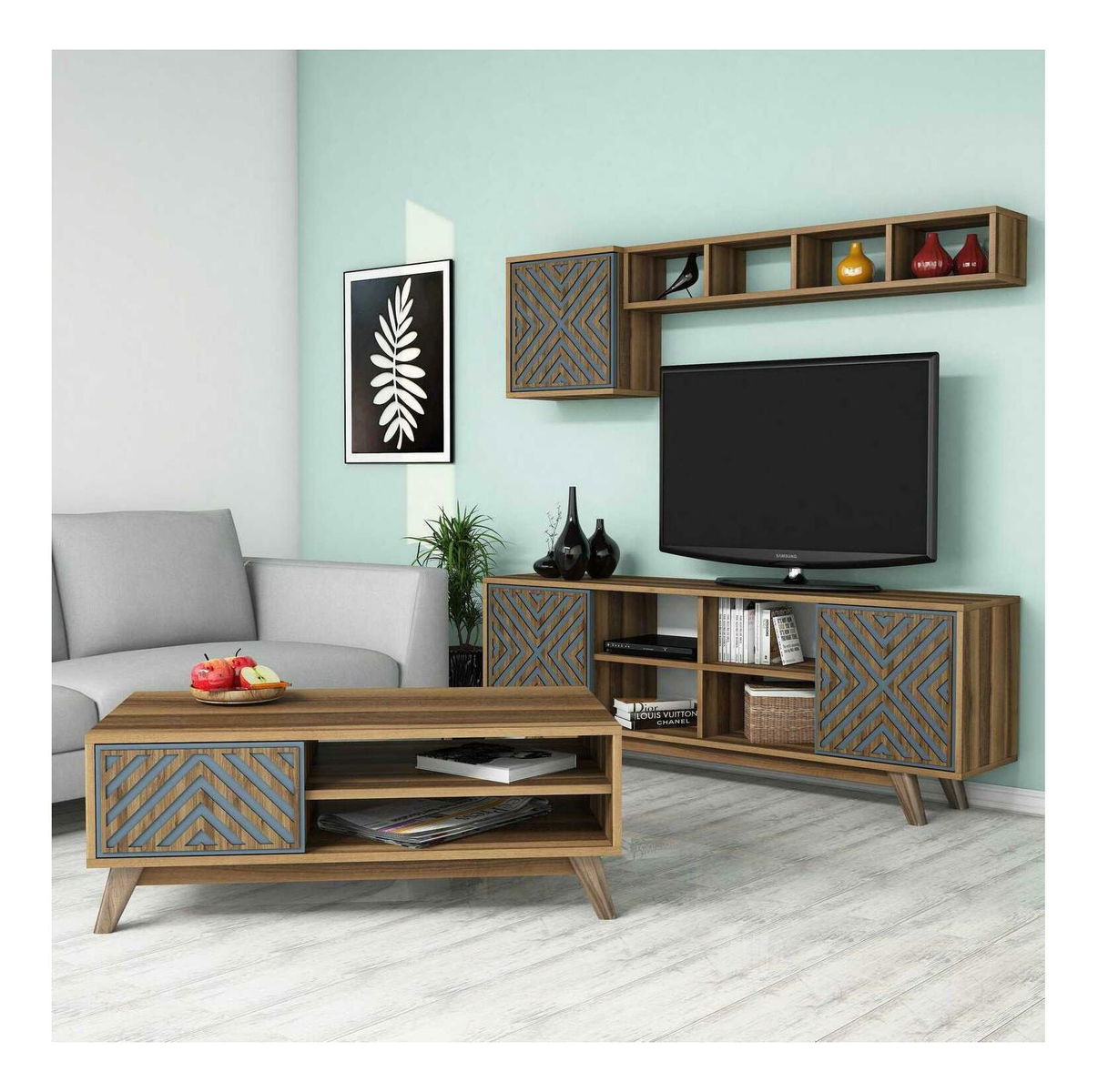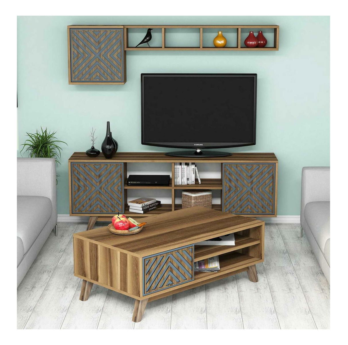 Sestava nábytku do obývacího pokoje Inge (ořech + modrá)