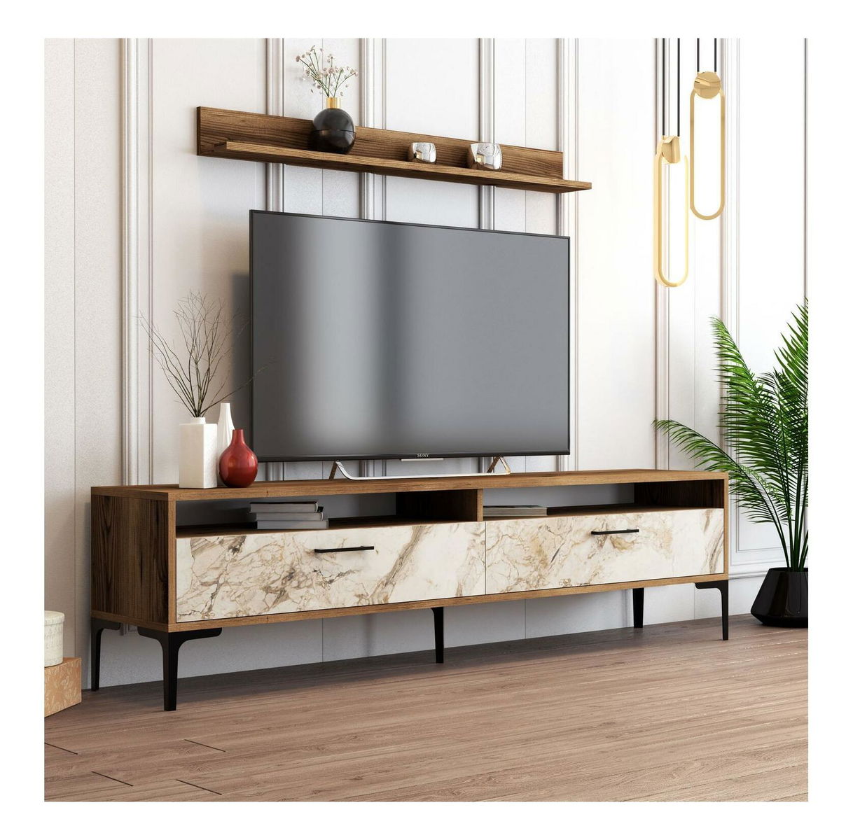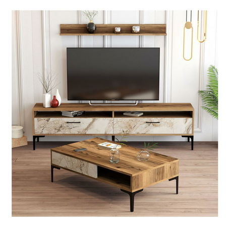 tloušťka: 18 mm, stojan na TV: šířka: 180 cm, výška: 47 cm, hloubka: 35 cm, velikost nástěnné police: šířka: 120 cm, výška: 11,8 cm, hloubka: 16 cm, konferenční stolek: šířka: 105 cm, výška: 32,6 cm, hloubka: 60 cm, kovové nohy,: 17 cm