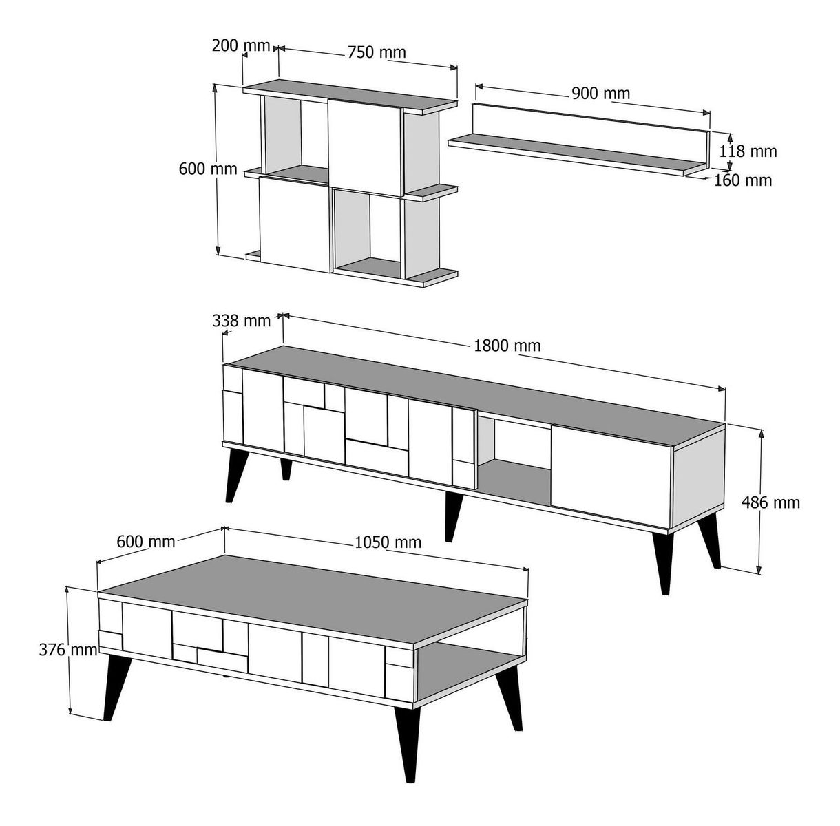 tloušťka: 18 mm, velikost TV jednotky: šířka: 180 cm, výška: 48,6 cm, hloubka: 33,8 cm, velikost skříňky: šířka: 75 cm, výška: 60 cm, hloubka: 20 cm, velikost nástěnné police: šířka: 90 cm, výška: 11,8 cm, hloubka: 16 cm, rozměr konferenčního stolku: šířka: 105 cm, výška: 37,6 cm, hloubka: 60 cm