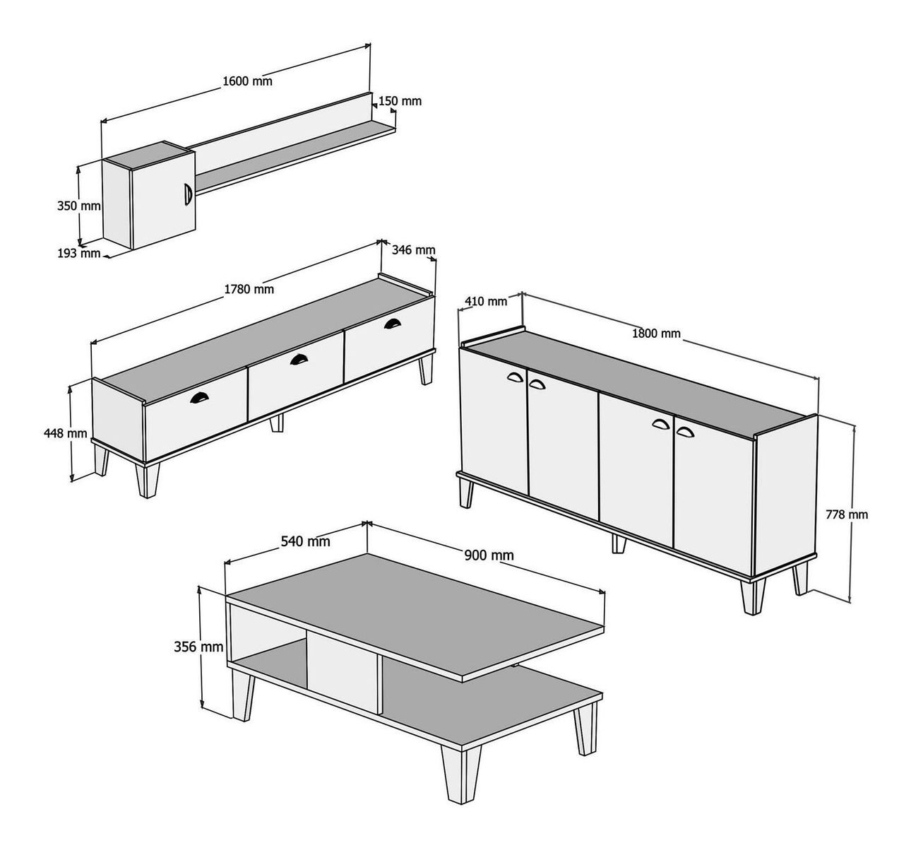 tloušťka: 18 mm, velikost TV stojanu: šířka: 178 cm, výška: 44,8 cm, hloubka: 34,6 cm, velikost police: šířka: 160 cm, výška: 35 cm, hloubka: 19,3 cm, velikost konzoly : šířka: 180 cm, výška: 77,8 cm, hloubka: 41 cm, rozměr konferenčního stolku: šířka: 90 cm, výška: 35,6 cm, hloubka: 54 cm