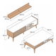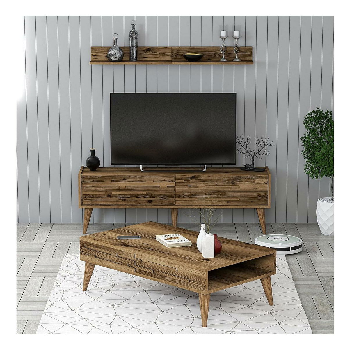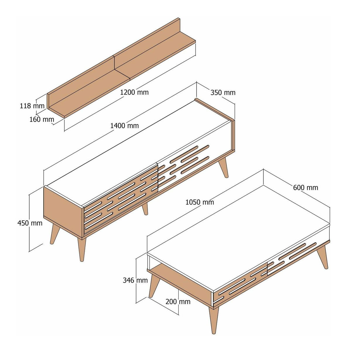 tloušťka: 18 mm, velikost TV stojanu: šířka: 140 cm, výška: 35 cm, hloubka: 45 cm, velikost nástěnné police: šířka: 120 cm, výška: 16 cm, hloubka: 11,8 cm, velikost konferenčního stolku: šířka : 105 cm, výška: 60 cm, hloubka: 34,6 cm, výška nohou: 20 cm