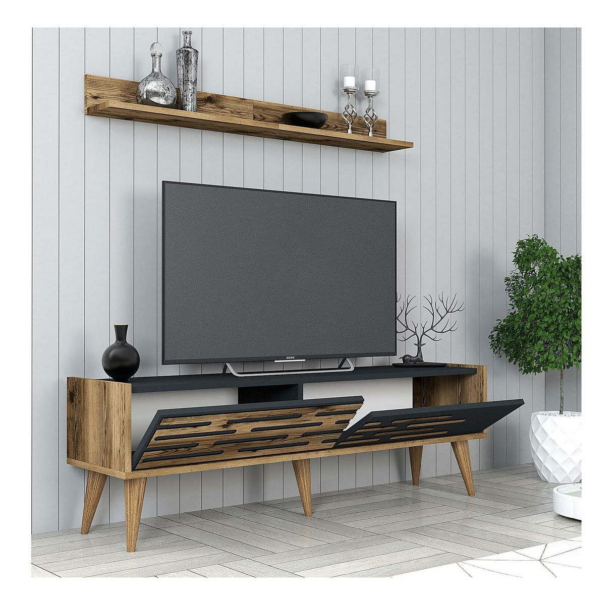 tloušťka: 18 mm, velikost TV stojanu: šířka: 140 cm, výška: 35 cm, hloubka: 45 cm, velikost nástěnné police: šířka: 120 cm, výška: 16 cm, hloubka: 11,8 cm, velikost konferenčního stolku: šířka : 105 cm, výška: 60 cm, hloubka: 34,6 cm, výška nohou: 20 cm