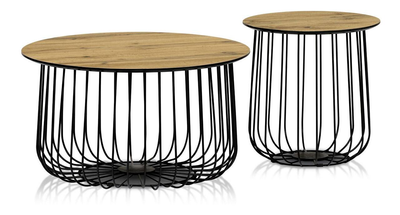 Set 2 ks variabilních a multifunkčních stolků, které můžete využít nejen jako konferenční set, ale skvěle poslouží také jednotlivě jako odkládací nebo přístavné. A to není všechno. Po odklopení desky může stolek sloužit jako úložiště nebo odkladiště jistě potřebných věcí v domácnosti, které musíte mít stále po ruce nebo jen jako pokorný dekorativní prvek v interiéru, na který postavíte například jen květinu. Variabilita je opravdu neomezená a stačí zapojit fantazii. Co je třeba dát dovnitř stolků vlastní květinové aranže či jinak vydekorovat nebo umístit příhodnou živou květinu. Potom už se stačí jen kochat vlastní tvorbou a se zalíbením sledovat závistivé pohledy návštěv. Stolky jsou v lehkém minimalistickém designu ve velmi oblíbeném industriálním stylu. Desky jsou z MDF tl. 18 mm, ze spodní části v černém matu se sraženou obvodovou hranou a v horní pohledové ve 3D dekoru divoký dub. Drátěná kovová konstrukce ze subtilních kulatých profilů je v černém matu, povrchová úprava je kvalitním práškovým vypalovacím lakem. Ve spodní části jsou gumové patky, které zamezují poškození povrchu tvrdých podlah a zároveň zabraňují i nechtěnému posunu stolků. Větší stolek má průměr desky 60 cm a výšku 34 cm, vyšší má průměr 37 cm a výšku 39 cm. Nosnost stolků je do 30 kg každý. Stolky jsou velmi nenáročné na údržbu, stačí je otřít vlhkým hadříkem s vhodným čistícím prostředkem a už jen vysušit. Tento klad jistě ocení každý, a to nejen při úklidu. A dalším skvělé plus je, že zcela odpadá složitá montáž. Jen opatrně vybalíte, nasadíte desky a stolky jsou připraveny Vám sloužit dlouhá léta a vnést do Vašeho interiéru šarm industriálního stylu.