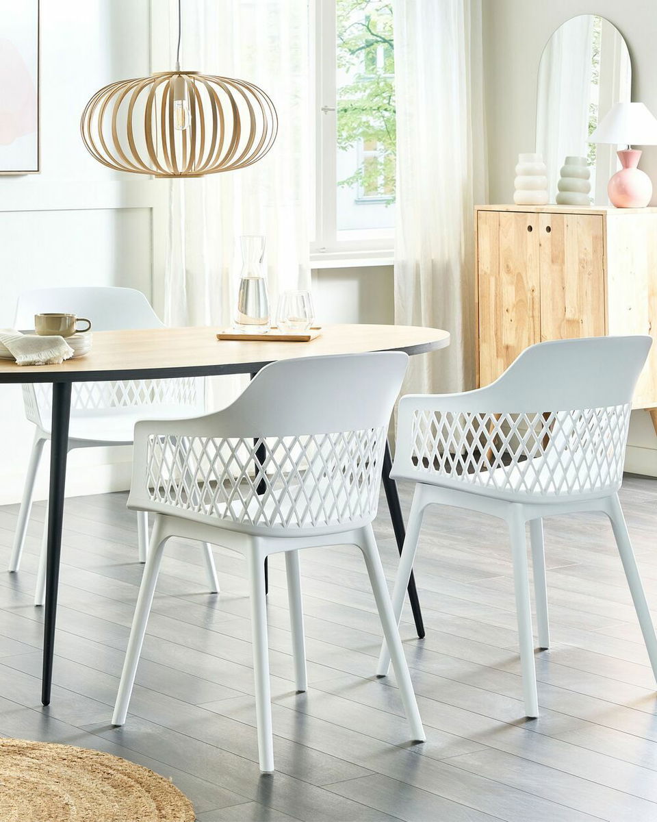 Pomocí této soupravy židlí vnesete do kuchyně nebo jídelny nádech minimalistické elegance. Jsou vyrobeny ze syntetického materiálu, díky kterému jsou pevné a snadno se čistí, takže jsou ideální pro každodenní používání. Nejenže jsou vizuálně zajímavé, ale díky ergonomickému designu i velmi pohodlné. Díky nízké hmotnosti je lze snadno přesunout a použít pro různé účely, díky čemuž jsou praktickým doplňkem vhodným do jakéhokoli prostoru. Ať už pořádáte večeři nebo si jen vychutnáváte jídlo se svými blízkými, tyto židle vám poskytnou stylové a pohodlné místo k sezení.