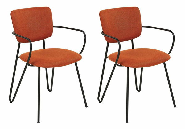 Díky těmto jídelním židlím bude každé jídlo ještě o něco chutnější a vy se při stolování budete moci pohodlně usadit. Jsou vyrobeny z odolného polyesteru, jsou měkké a nenáročné na údržbu, takže jsou ideálními doplňky do rušných domácností. Díky svému modernímu vzhledu jsou skvělou volbou do moderních interiérů, kde je černý, železný rám v kombinaci s oranžovou barvou skutečně zazáří.