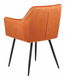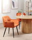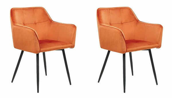 Minimalistický a zároveň luxusní design židlí zaujme svým neobvyklým nadčasovým vzhledem. Jemné linie židlí podtrhuje oranžové sametové čalounění s prošívanými detaily. Hladká textura a jednolitá barva čalounění osvěží jakoukoli místnost. Židle se štíhlýma kovovými nohama se hodí k jídelnímu stolu, ale i do ložnice či domácí knihovny.