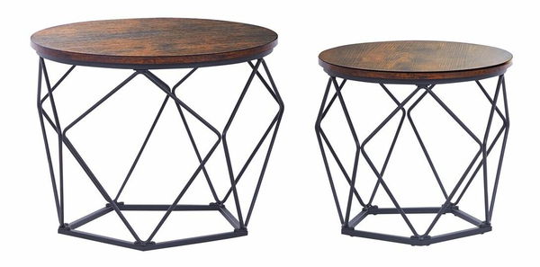 Tato sada dvou konferenčních stolků zvýrazní vzhled vašeho obytného prostoru. Vrch obou stolků, vyrobený z odolné dřevotřísky v barvě tmavého dřeva, je odnímatelný. Geometrická kovová základna v černém provedení doplňuje celkový design stolků. Souprava konferenčních stolků je ideální pro servírování nápojů nebo občerstvení a lze ji použít i pro vystavení dekorativních váz a různých předmětů.