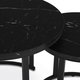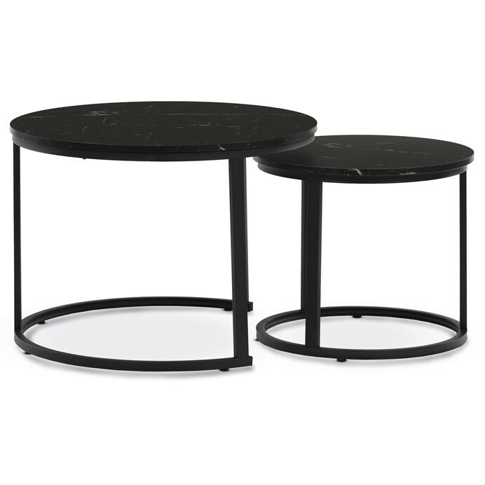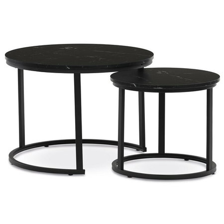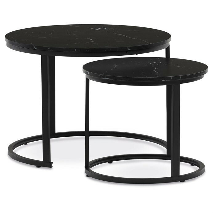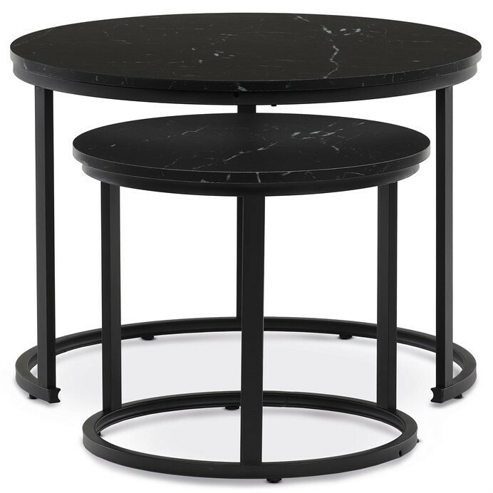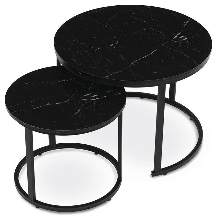 Set dvou konferenčních stolků s deskami z MDF v dekoru černého mramoru a matnou povrchovou úpravou nabízí moderní řešení pro obývací pokoje nebo kanceláře. Kovová podnož v černém laku zajišťuje pevnou a stabilní oporu, zatímco kulatý tvar stolků přispívá k elegantnímu a vzdušnému vzhledu. Větší stolek má výšku 50 cm, menší je o něco nižší, což umožňuje jejich praktické zasunutí a variabilní uspořádání prostoru. Kombinace kvalitních materiálů a precizního zpracování zaručuje dlouhou životnost a snadnou údržbu. Tento set je vhodný do moderních interiérů, kde oceníte funkčnost i design.
