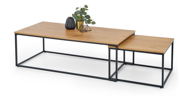 ZobrazitSet 2 ks. konferenčních stolků Saiph Dub zlatý + Černá je skvělou volbou pro ty, kteří hledají elegantní a moderní stolky pro svůj prostor. Tento set obsahuje dva stolky různých velikostí, které jsou vyrobeny z kvalitního MDF laminátu a práškově lakované ocelové konstrukce. Větší stolek má rozměry 40 x 120 x 60 cm a menší stolek má rozměry 36 x 55 x 55 cm. Oba stolky mají krásnou barvu dubu a zlaté nohy s černou stolovou deskou, které dodají vaší místnosti moderní vzhled. Tyto stolky jsou skvělým řešením pro společenské akce nebo jako příjemné místo k odpočinku při čtení knihy nebo pití kávy.
