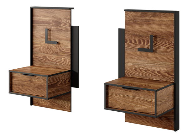 ZobrazitModerní závěsné noční stolky jsou praktickým i stylovým doplňkem každé ložnice. Korpus je vyroben z laminované dřevotřísky E05 a přední plochy doplňuje 18 mm MDF deska pro vyšší pevnost a elegantní vzhled. Zadní deska v dekoru dub craft zlatý přidává celku příjemný přírodní akcent, zatímco černé kovové úchyty podtrhují moderní charakter. Každý stolek je vybaven jednou zásuvkou s kuličkovými ložisky a plným výsuvem, která nabízí praktický prostor pro odložení drobností. Mechanismus tichého zavírání zajišťuje pohodlné a šetrné používání. Stolky jsou řešeny jako závěsné, což působí vzdušně a usnadňuje udržování čistoty v ložnici. Součástí výbavy je integrované LED osvětlení, které navodí příjemnou atmosféru a dodá ložnici moderní nádech. Tento set dvou nočních stolků je dokonalým spojením funkčnosti, stylu a pohodlí pro váš každodenní odpočinek.