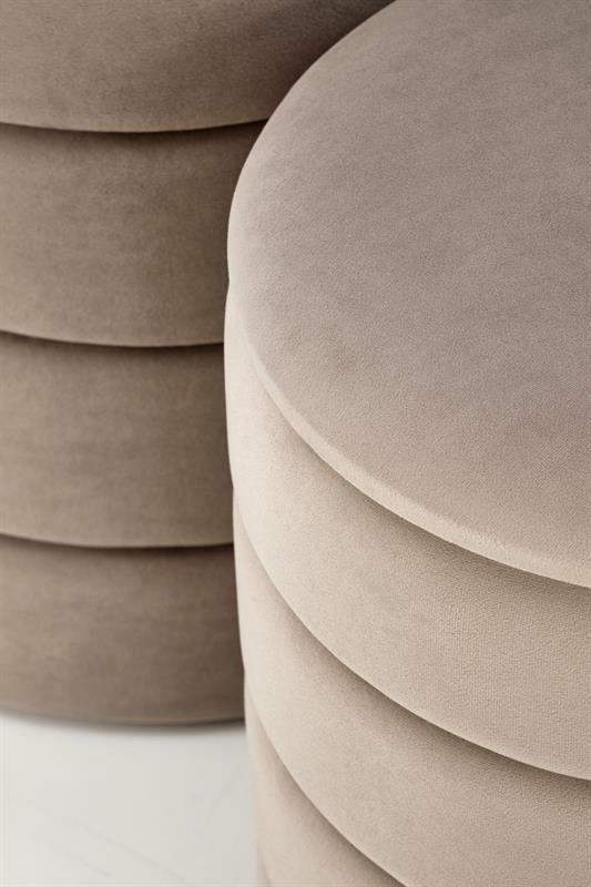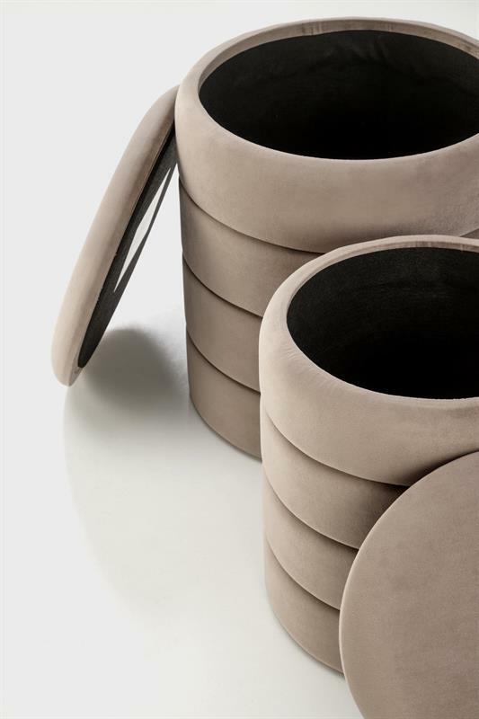 Tato moderní taburetka s kulatým tvarem a bez nožiček je ideálním řešením pro stylové a praktické bydlení. Je čalouněná v měkké velurové tkanině, která přidává na jejím luxusním vzhledu. Skrytý úložný prostor pod sedadlem nabízí praktické místo pro ukládání různých předmětů, čímž zefektivňuje využití prostoru v místnosti. Tato taburetka je perfektním doplňkem do moderních interiérů, kde spojuje eleganci s funkčností, poskytující tak nejen pohodlné sezení, ale také doplňkové úložné řešení.