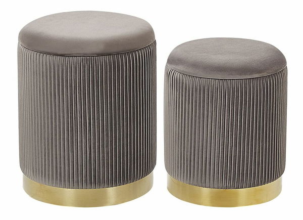 Ozdobte svůj interiér touto soupravou 2 čalouněných taburetek. Obě jsou vybaveny prostorným úložným prostorem, který je ukryt pod víkem na sedadle. Díky snadno udržovatelnému a odolnému sametovému čalounění vydrží dlouhá léta. Díky poutavému svislému prošívání na čalounění v kombinaci s šedou a zlatou barvou obohatí každý prostor a vnesou do něj nádech moderního stylu.