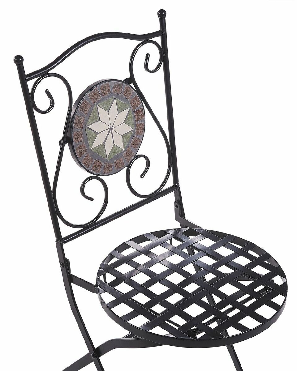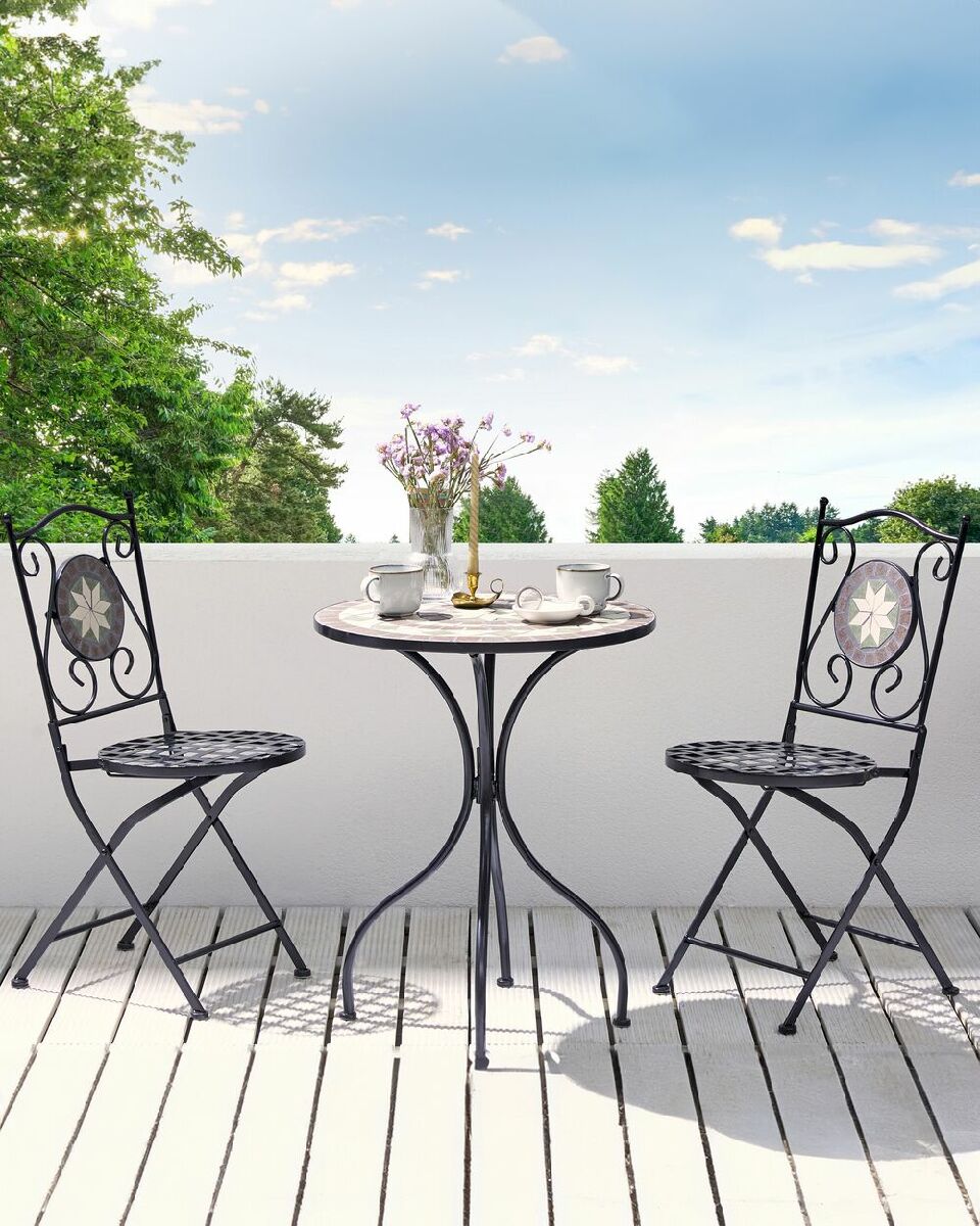 Vychutnejte si šálek čaje na čerstvém vzduchu s touto okouzlující sadou venkovních židlí. Jsou ideální do malých i velkých prostor, mají jedinečná opěradla a zajímavý mozaikový vzor vyrobený z keramických dlaždic. Vytvořte si útulný koutek na dvoře nebo balkoně, kde budete moci nerušeně odpočívat. Židlem vyrobeným z kovu neublíží ani déšť a díky tomu, že jsou skládací je mimo sezónu jednoduše uskladníte.