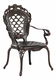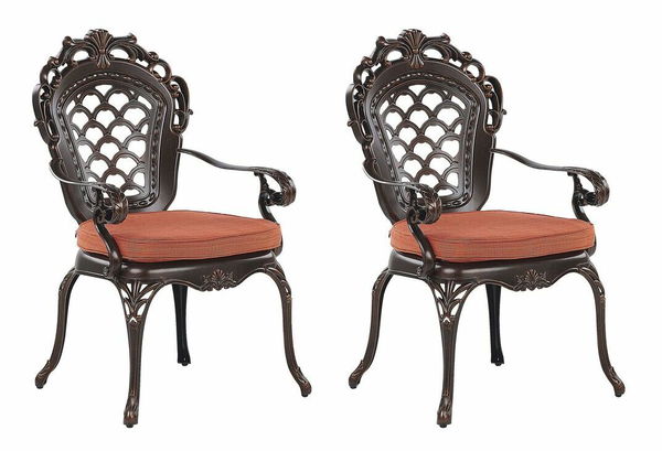 Tato sada dvou klasických, vintage židlí obohatí každý venkovní prostor a dodá mu elegantní nádech. Souprava je vyrobena z odolného a zároveň lehkého hliníku, který se snadno udržuje. Zaoblené linie, hnědé barevné provedení a složitý ozdobný vzor jim dodává luxusní, elegantní vzhled, který zkrášlí jakýkoli prostor. Židle jsou dodávány s měkkými sedacími polštáři pro ještě větší pohodlí.