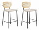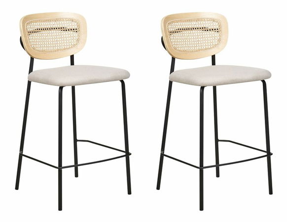Zkrášlete vzhled své kuchyně nebo jídelny pomocí této nádherné sady barových židlí. Jejich opěradla jsou vyrobena z ratanu a překližky ve světlém odstínu, díky čemuž jsou mimořádně odolná a nenáročná na údržbu. Sedadla jsou čalouněna světle béžovou polyesterovou tkaninou, zatímco rámy vyrobené ze železa v černé barvě jsou zárukou celkové stability. Díky univerzálnímu designu židle zapadnou do různých stylů interiéru – od retro až po moderní.