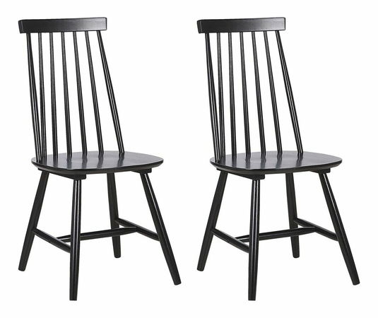 Přineste do interiéru minimalismus v podobě těchto odolných a elegantních dřevěných židlí. Židle jsou vyrobeny z odolného masivního dřeva s lesklým černým nátěrem. Široké sedátko je doplněno šikmým lamelovým opěradlem, které dodává tomuto klasickému designu šmrnc a vytváří vzhled inspirovaný skandinávským stylem. Zkombinujte je se stolem v jídelně, nebo je použijte jako samostatný doplněk v kuchyni či obýváku.