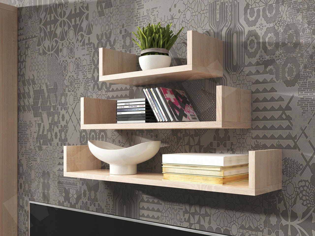 ZobrazitCyzara je sada závěsných polic se 3 různými velikostmi: 40x18, 60x18 a 80x18cm. Vyrobeny byly z laminované desky potažené ABS hranou. Police mají univerzální barvy, které zapadnou do každého interiéru. Ideální pro obývací pokoj, ložnici, jídelnu a obývací pokoj. Police mohou sloužit jako místo pro vystavení dekorací, knih nebo fotografií ze vzdálených cest.