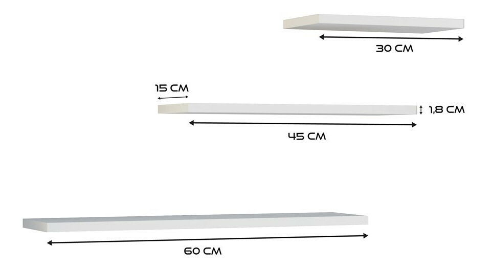 ZobrazitSet 3ks. nástěnných polic Tachados 1 v elegantní bílé barvě je ideálním řešením pro každou domácnost, kde je kladen důraz na stylové a praktické uspořádání. Tyto poličky jsou vyrobeny z kvalitní laminované nábytkové desky, která zaručuje dlouhou životnost a odolnost. S rozměry 60, 45 a 30 cm jsou dostatečně prostorné pro vystavení knih, fotografií nebo pokojových rostlin, čímž dodají vašemu interiéru osobitý charakter. Set polic se jednoduše montuje a stane se skvělým doplňkem k vašim stávajícím nábytkům.