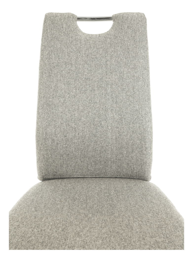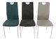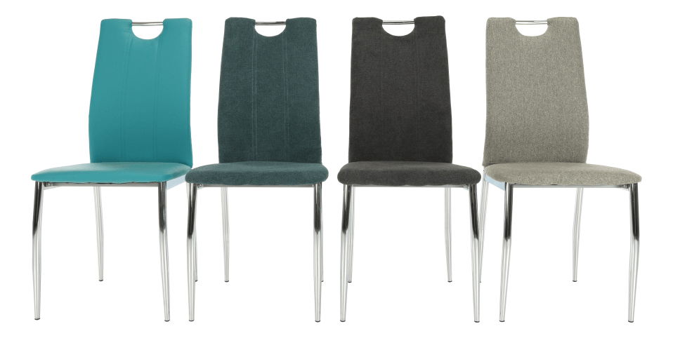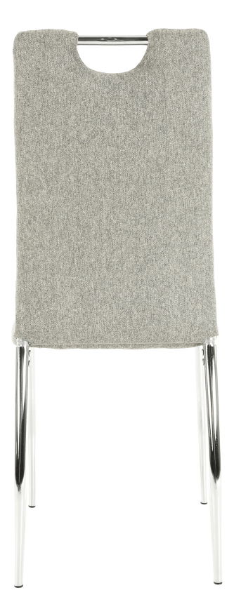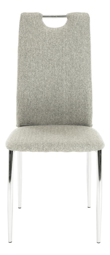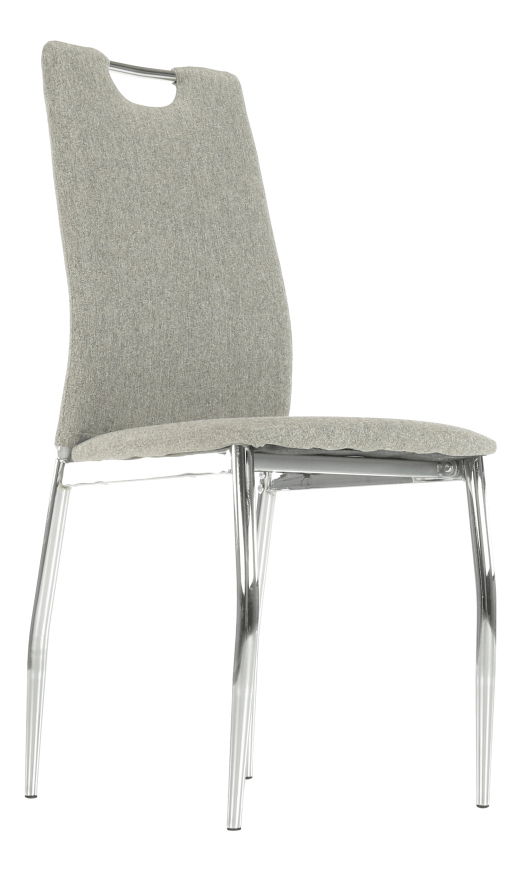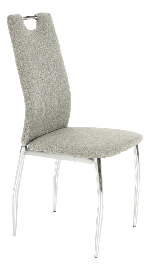 Pěkná jídelní židle, která má zaoblené opěradlo s výřezem ve vrchní části a zaoblené chromové nožičky.