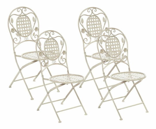 Dodejte svému balkonu nebo zahradě provensálskou atmosféru s touto elegantní sadou čtyř židlí. Jsou vyrobeny ze železa s práškovým lakováním a vyznačují se opotřebovaným, vintage efektem a ozdobným designem s květinovými ornamenty. Doplňte je odpovídajícím stolkem a vytvořte si dokonalý prostor k snídani nebo obědu v jakémkoli venkovním prostředí. Židle jsou skládací, takže je mimo sezónu můžete jednoduše uskladnit.