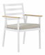 Vychutnejte si večeři pod širým nebem díky těmto pohodlným jídelním židlím. Jejich bílá hliníková konstrukce s povrchovou úpravou s práškovým lakováním zajišťuje jejich odolnost a dlouhodobou životnost. Klasické lamelové opěradlo dodává židlím skandinávský nádech, díky čemuž se perfektně hodí k široké škále tradičních i moderních stylů zařízení. Loketní opěrky jsou pokryty syntetickým dřevem, které chrání před studeným kovem a zároveň vytváří jemný kontrast. Dodávají se s ladícími polštáři k sezení v příjemné béžové barvě.