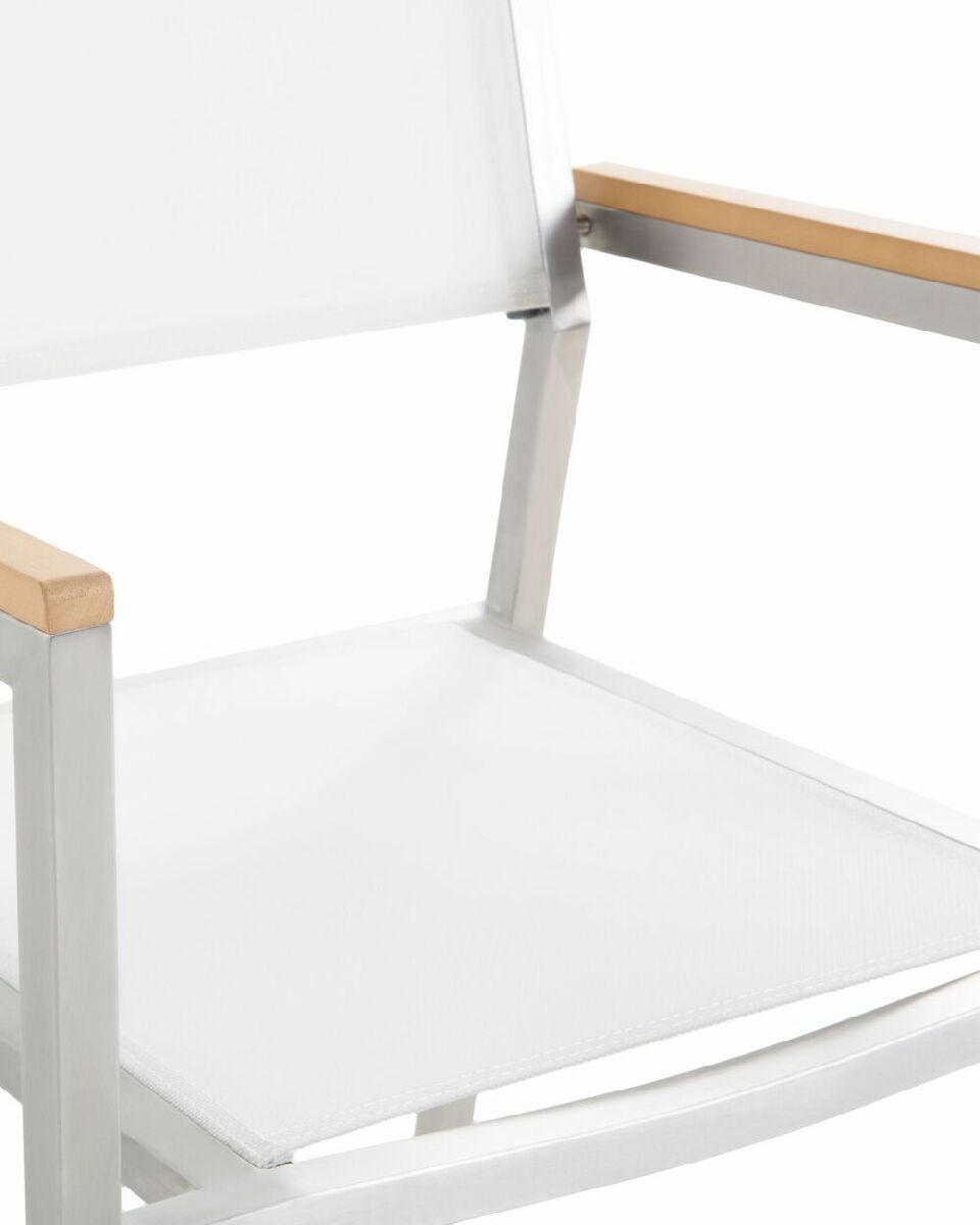 Tato sada zahradních židlí je ideální volbou na terasu nebo do zahrady. Rám židlí je vyroben z odolné oceli, která zaručuje stabilitu, a dřevěné detaily na opěrkách rukou vás ochrání před chladnou kovovou konstrukcí. Sedák a opěradlo jsou vyrobeny z bílé textilní látky, která je zárukou maximálního komfortu.