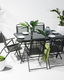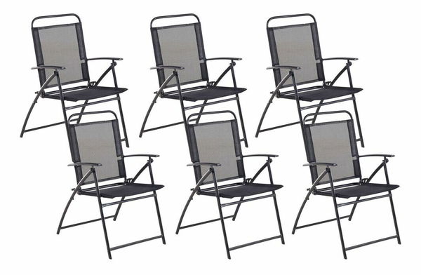 Tato sada šesti skládacích venkovních židlí, která je lehká a odolná vůči povětrnostním vlivům, bude perfektním doplňkem každého balkonu, terasy nebo zahrady. Rám židlí je vyroben z lehké oceli s práškovým lakováním, s materiálem odolným vůči UV záření na sedadle a opěradle. Díky všestrannému designu se židle hodí do každého moderního prostoru.