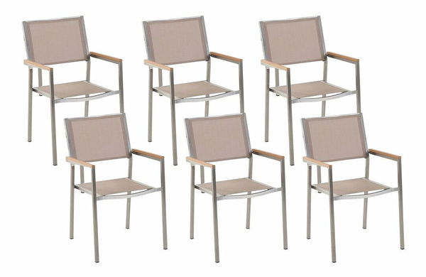 Tato sada zahradních židlí je ideální volbou na terasu nebo do zahrady. Rám židlí je vyroben z odolné oceli, která zaručuje stabilitu, a dřevěné detaily na opěrkách rukou vás ochrání před chladnou kovovou konstrukcí. Sedák a opěradlo jsou vyrobeny z béžové textilní látky, která je zárukou maximálního komfortu.