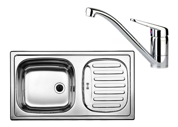 Set pákové baterie a dřezu. Nerezový dřez Flex Mini s vaničkou a odkládacím prostorem na umyté nádobí. Otvor na baterii má průměr 35 mm. Chromová baterie Daras je s vysokým a dlouhým odtokem vody bez spršky.