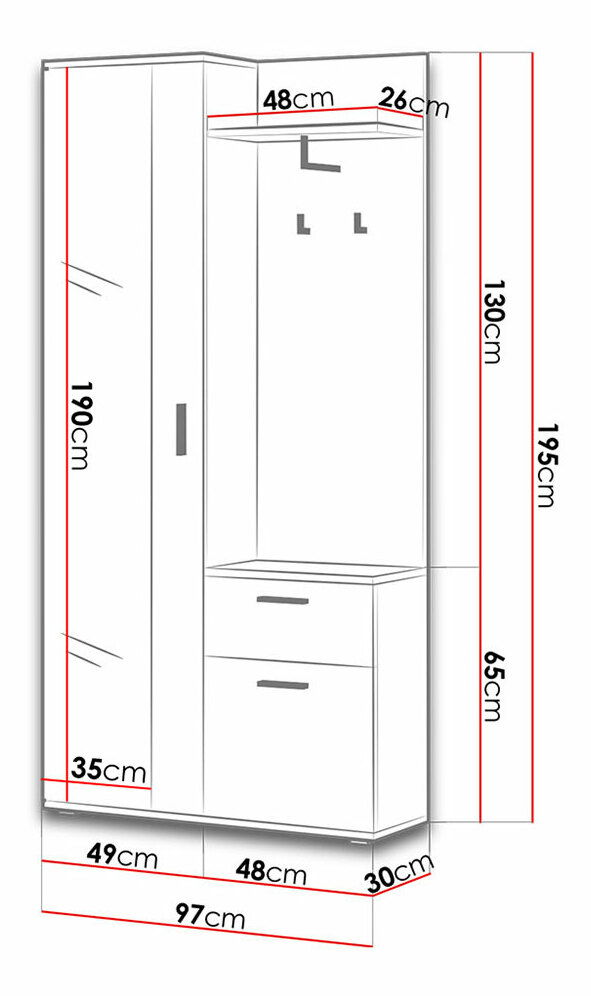 ZobrazitClimax je jednoduchá, funkční a velmi praktická předsíň, která funguje skvěle i v malé místnosti. Má moderní styl, který dokonale zapadá do současných trendů uspořádání. Skříň do předsíně je vybavena zrcadlem na přední straně, poličkou, věšákem na šaty a praktickými úložnými prostory pro ukládání drobností - rukavic nebo klobouků. Tento model je vyroben z odolné laminované dřevotřísky s výběrem barev, které jistě potěší lidi, kteří ocení nadčasová řešení.