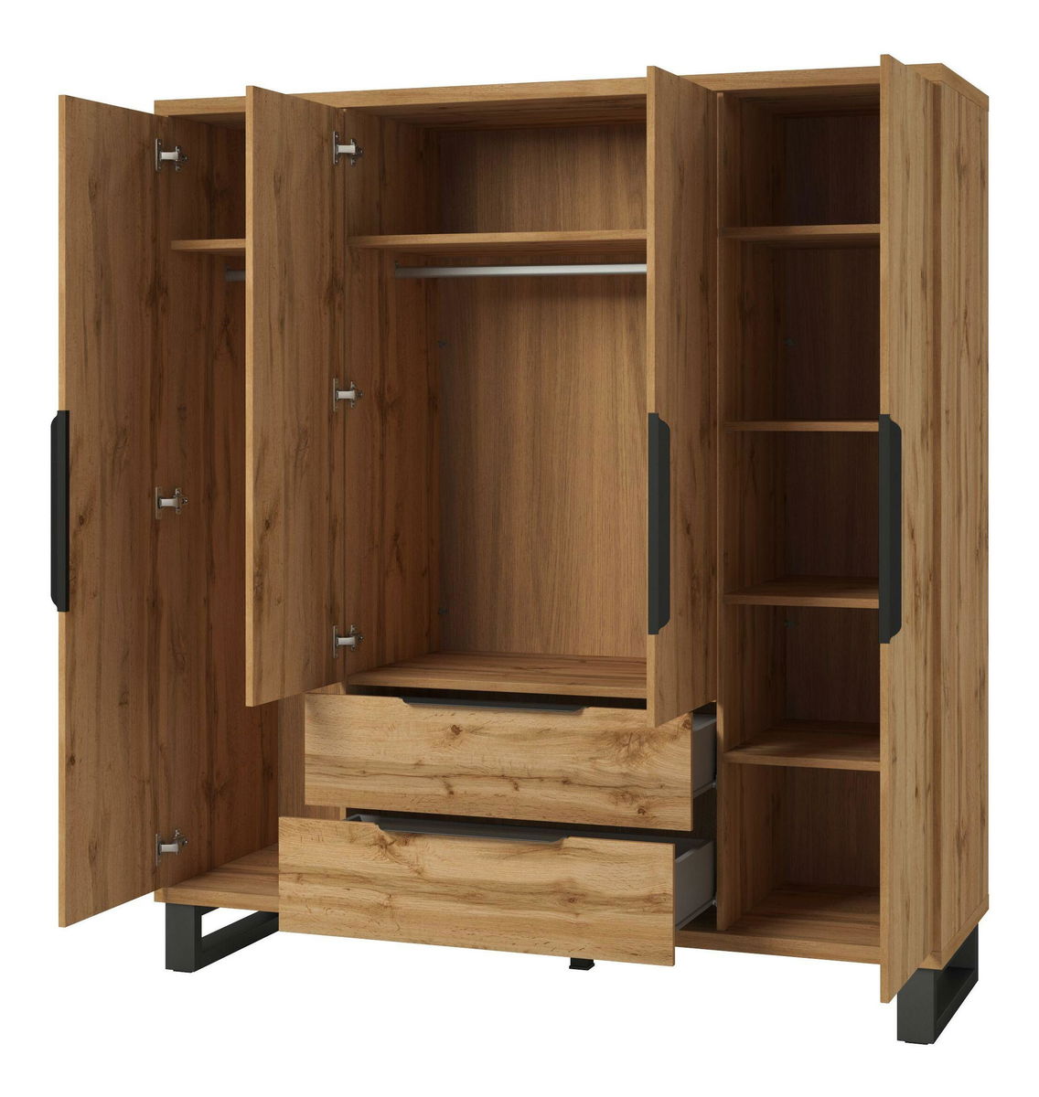 Šatní skříň - Helles L (dub wotan + černá) - Elegantní kus se 4 dveřmi a 2 zásuvkami pro maximální organizaci vaší domácnosti. Překližka se vzorem dubu wotan a štíhlé, minimalistické úchytky dodávají této skříni moderní a zároveň útulný vzhled.