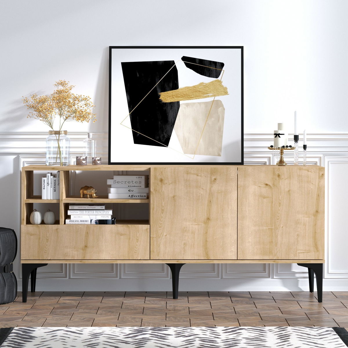 Skříňka - Ornella (Dub) o výšce 40 cm, šířce 180 cm a hloubce 180 cm je ideálním doplňkem vašeho obývacího prostoru. Tento kvalitní kousek nábytku je vyroben z masivního dubového dřeva, což mu zajišťuje pevnost a odolnost. Díky své velké šířce poskytuje dostatek místa pro vaši televizi, DVD přehrávač, herní konzoli a další zařízení. Skříňka je vybavena praktickými úložnými prostory, které vám umožní udržet váš obývací prostor čistý a uklizený. Svým moderním designem a elegantním vzhledem dodává vašemu interiéru stálový a sofistikovaný dotek. Skříňka - Ornella (Dub) je dokonalou volbou pro ty, kteří hledají spojení praktičnosti a estetiky v jednom kuse nábytku.