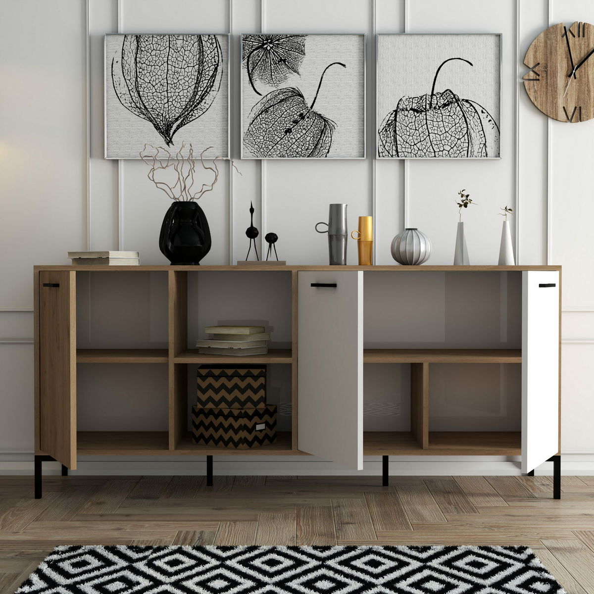 Skříňka - Aura (Dub + Bílá) je praktickým a stylovým nábytkovým kusem pro váš domov. S výškou 80 cm, šířkou 180 cm a hloubkou 45 cm, tato skříňka nabízí dostatek úložného prostoru pro vaše věci. Je vyrobena z kvalitního dřeva dub a je bílým odstínem, což dodává elegantní a čistý vzhled. Skříňka má dostatečně velké úložné prostory, které vám umožní udržovat pořádek ve vaší domácnosti. Svým moderním designem a praktickým rozložením je skříňka Aura ideálním doplňkem pro váš interiér.