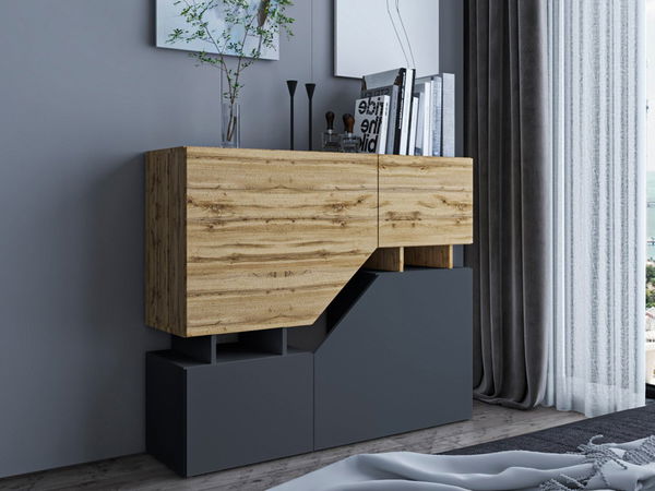 ZobrazitSkříňka zaujme svým vzhledem. Asymetrická dvířka vytvářejí zajímavý vzor, který se stane hlavní dekorací interiéru každého obývacího pokoje. Módní efekt umocňuje pečlivě vybraná kombinace barev. Osvěží obývací pokoj a přidá trochu futuristických prvků. Vnitřek komody nabízí spoustu úložného prostoru. Otevřené police v kombinaci s uzavřenými skříňkami vytvářejí optimální podmínky pro uložení doplňků v obýváku. Za dvířky můžete ukrýt knihy, sbírky CD a příslušenství používané pro DVD přehrávač.