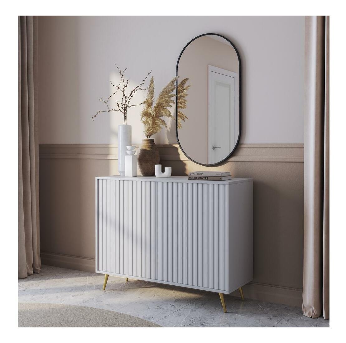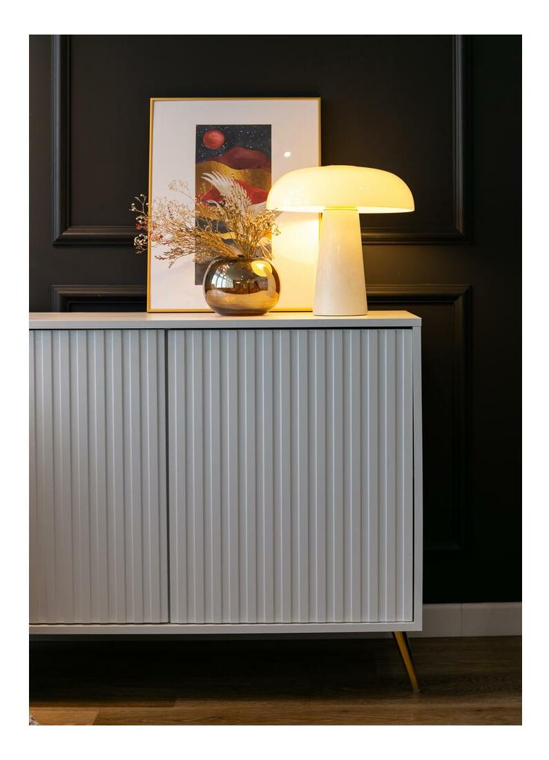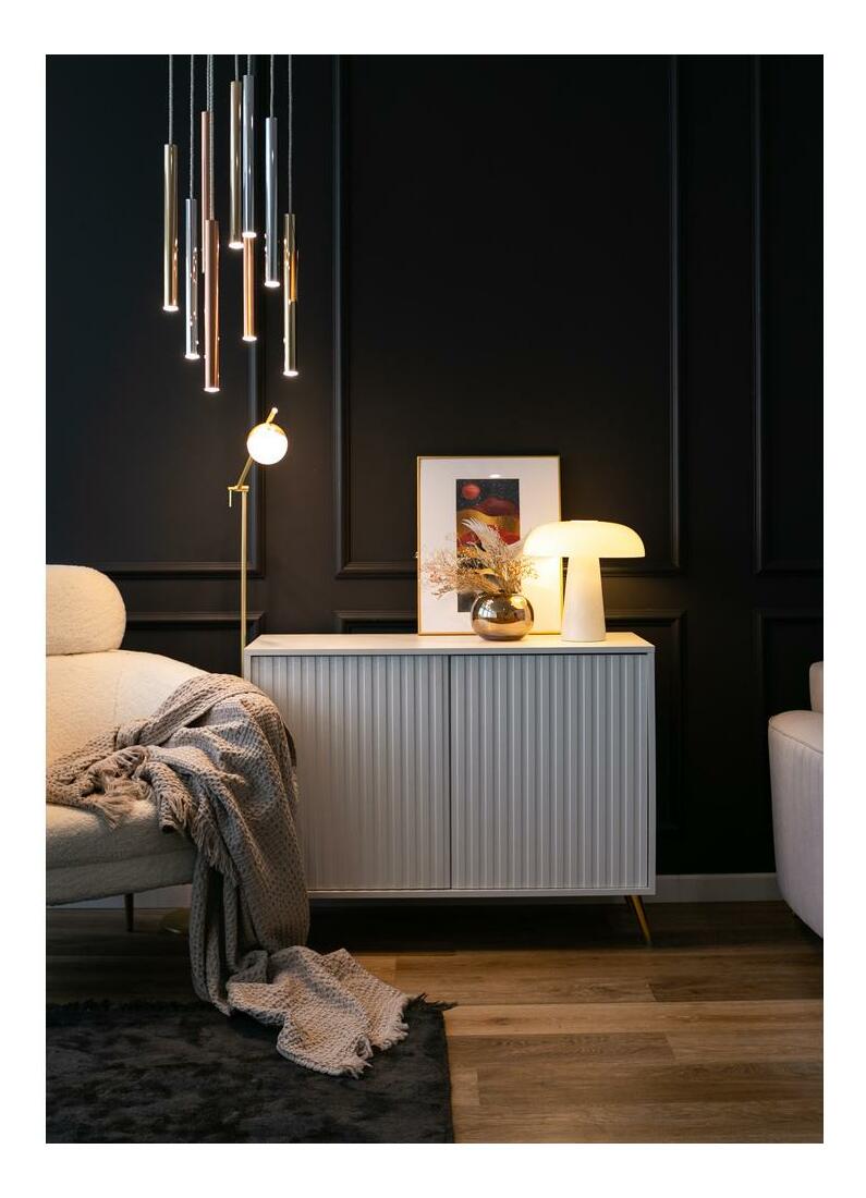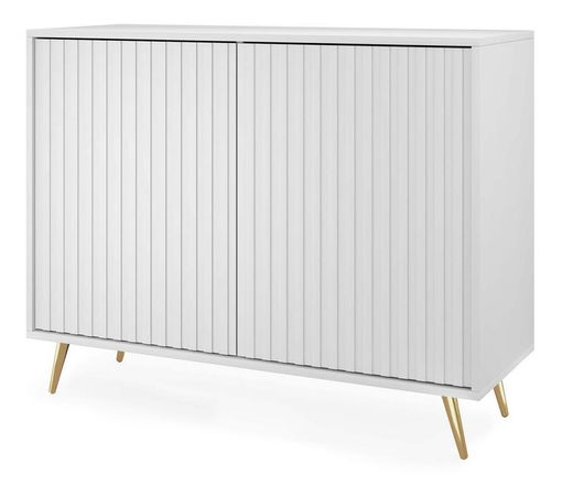 Máte rádi klasický nábytek s moderním nádechem svěžesti? Výběrem kolekce vnesete do svého interiéru elegantní, ale klasický vzhled! Komoda bude skvělou volbou pro lidi, kteří potřebují spoustu úložného prostoru. Nábytek má čtyři prostorné, uzavřené přihrádky, kam schováte všechny své věci. Další výhodou je prostorná stolová deska, kde si můžete vystavit suvenýry z dlenky, fotografie vašich blízkých nebo sbírku malých sukulentů. Čelo má vkusný dekor v podobě lamel dodává komodě originální vzhled. Podrobnosti o produktu: maximální zatížení vnitřních poliček: 5 kg, a vrchní části: 20 kg, korpus a čela z nábytkové desky Kronospan 110 PE, zlaté nohy o výšce 15 cm dodávají nábytku eleganci a usnadňují udržování pořádku, matné provedení čel a korpusu, montáž nábytku pro samostatné použití.