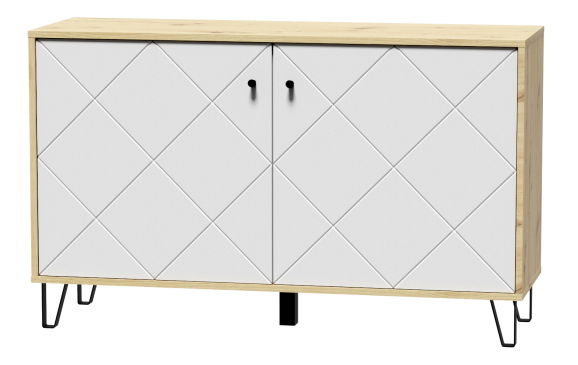 Vneste závan svěžesti a modernosti do svého obývacího pokoje v podobě světlého a moderního nábytku z kolekce BONNY. Působivá komoda zaujme už na první pohled. Obojí dvířka jsou vyfrézována do tvaru kosočtverců v matné bílé barvě. Stylovost této skříňce dodávají černé kovové úchyty a nožičky. Nábytek je vyroben z kvalitní dřevotřískové desky ošetřené ABS hranami.