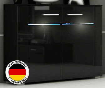 Moderní skříňka Bremen je vyrobena z těch nejkvalitnějších materiálů. Všechny komponenty tohoto nábytku jsou vyrobeny v Německu. Korpus je matné černé barvy, přičemž dvířka jsou ve vysokém lesku. K proskleným částem si lze přiobjednat efektní RGB osvětlení, při kterém máte možnost vybrat si až z devíti různých barev podsvícení. Díky tomu si můžete podle nálady měnit atmosféru místnosti. Doporučujeme kombinovat s obývací stěnou Bremen.