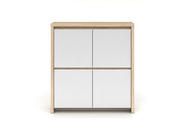 Elegantní skříňka jednoduchého designu se čtyřmi čtvercovými dvířky. Minimalistický styl skříňky zmodernizuje vaše interiéry. Dvířka na skříňce nemají úchyty, ale místo toho mají zkosené horní hrany.