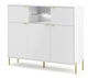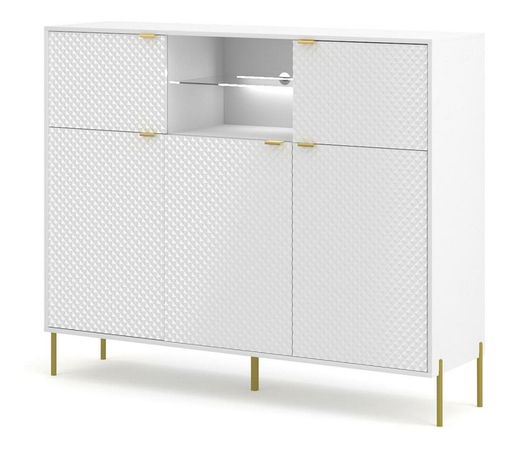 Jste milovníkem klasického nábytku s nádechem moderny? Pokud je odpověď ano, doporučujeme pětidveřovou komodu z kolekce, která dodá nevšední eleganci každé místnosti Představujeme pětidveřovou komodu v elegantním stylu! Rafinovaný a jednoduchý tvar vypadá perfektně! Má skleněnou polici, která vám umožní vystavit suvenýry a dekorace, a pět uzamykatelných skříněk usnadní přístup ke všemu, co chcete mít po ruce, ale ne nutně na očích. Čela komody jsou vyrobena z MDF desky, korpus je vyroben z dřevotřísky potažené melaminem. Drážkovaná přední část a kvé nožičky a rukojeti zlaté barvy mu dodávají jedinečný charakter. Nábytek je navíc vybaven LED osvětlením a systémem tichého zavírání Detaily produktu: korpus vyrobený z melaminové dřevotřísky tloušťky 16 mm, která zaručuje odolnost proti vlhkosti a poškození, drážkovaná čela z MDF desky tloušťky 18 mm, barva: bílá, povrchová úprava. : matný (korpus) a lesklý (čela), kvé nožičky a úchyty zlaté barvy, hrany vyztužené ABS hranami, systém tichého zavírání, LED osvětlení jako standard Dodejte svému obýváku šik ještě dnes!