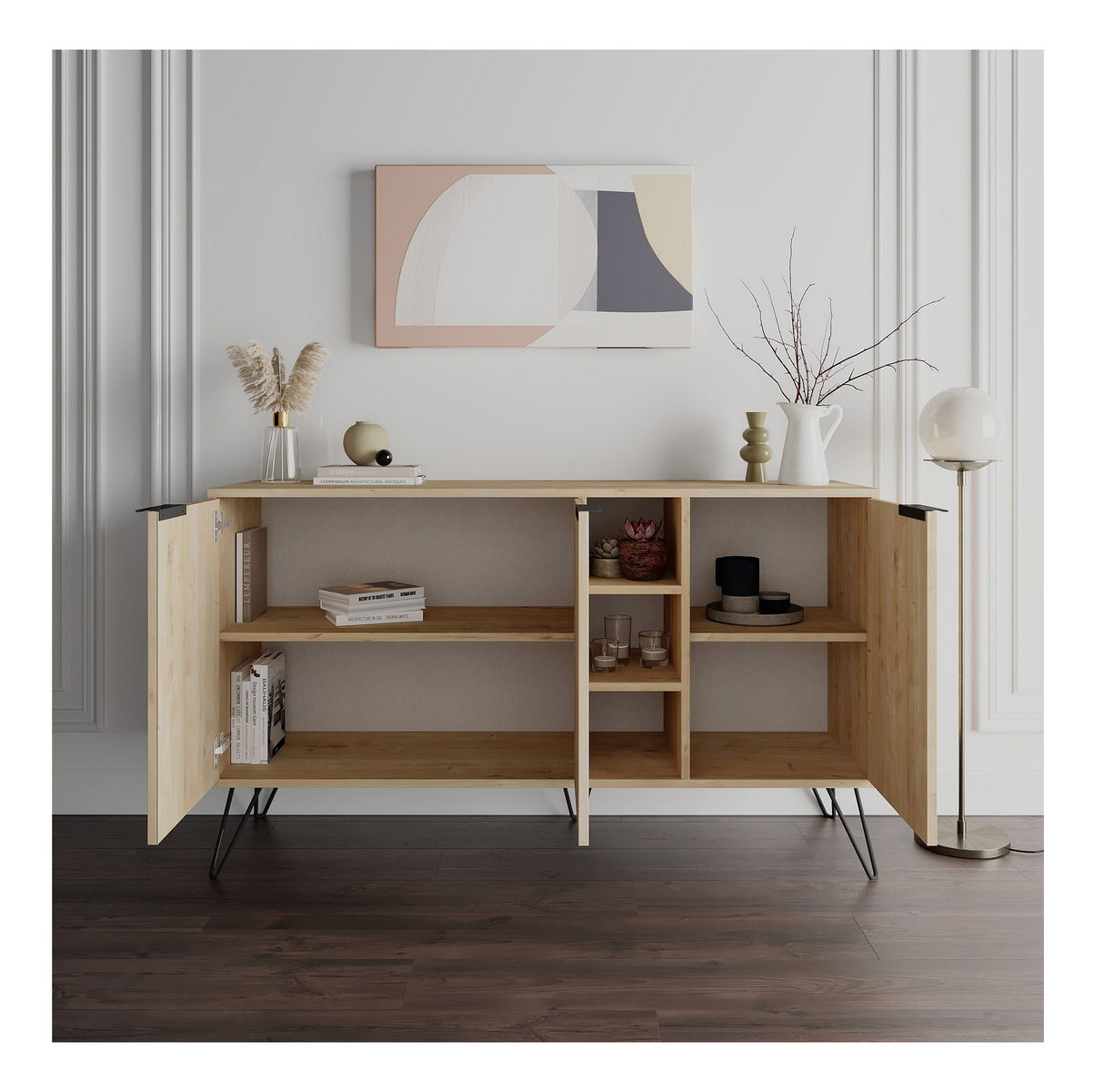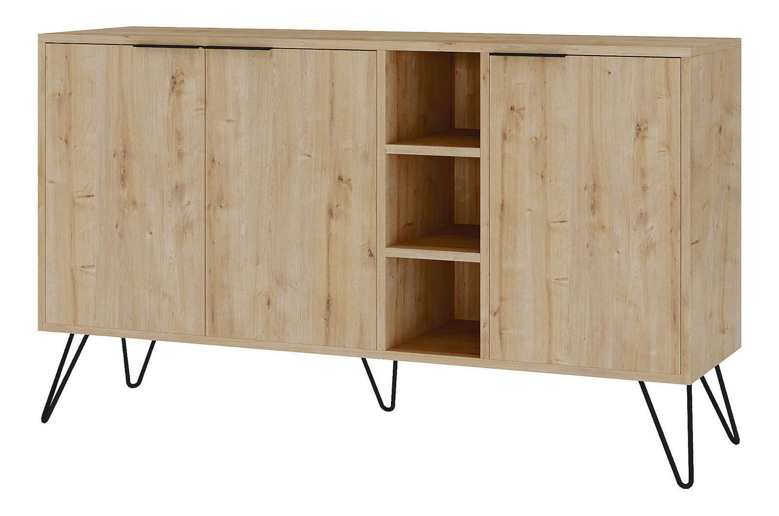 ZobrazitKomoda - Caius (dub) je praktickým a elegantním nábytkem pro vaši domácnost. S výškou 83 cm, šířkou 142 cm a hloubkou 35,6 cm nabízí dostatek úložného prostoru pro vaše věci. Její pěkný design s čistými liniemi by se hodil do jakéhokoli interiéru. více zásuvkami a policemi vám poskytuje možnost organizovat a uspořádat své předměty dle potřeby.