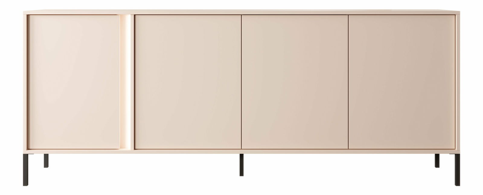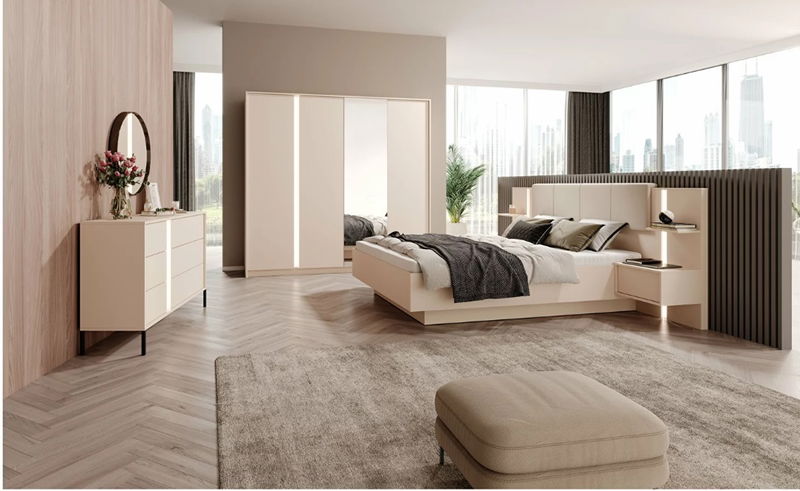 Kolekce DANTON se vyznačuje lehkostí a elegancí. Je to díky jejímu geometrickému tvaru a zajímavému vertikálnímu LED podsvícení ve výklencích, které dokonale ladí s jemnou béžovou barvou a prolamovanými černými kovovými nohami. To vytváří nekonečné možnosti designu. Tato kombinace rozzáří každý obývací pokoj a opticky jej zvětší. Nábytek má systém otevírání dvířek push-to-open.